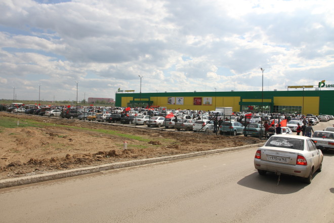 Сформировавшись, колона автомобилей начала выезжать, но у входа в торговый центр их стали останавливать полицейские. Стражи порядка проверяли документы и заставляли убирать флаги. Спустя какое то время, видимо из-за большого потока машин, проверка прекратилась и гаишники стали направлять автомобили в разные стороны. В итоге вместо одного автопробега получилось несколько десятков.