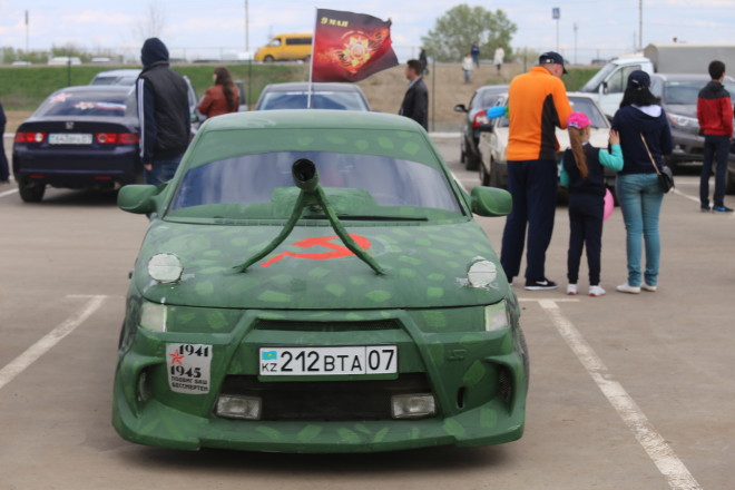 Один из водителей полностью выкрасил свое авто в зеленый цвет (на фото вверху) и на капоте прицепил муляж пушки. Полицейские остановили его, заставили снять эту "пушку" и оформили протокол по статье "Управление транспортным средством, переоборудованным без соответствующего разрешения". Теперь водитель должен выплатить штраф в размере 15 МРП, а это более 29 тысяч тенге.