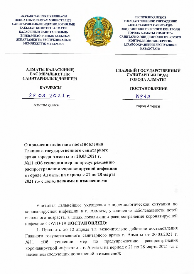 Постановление вступает в силу с 29 марта. Полный текст постановления опубликован на странице Департамента санитарно-эпидемиологического контроля города Алматы.