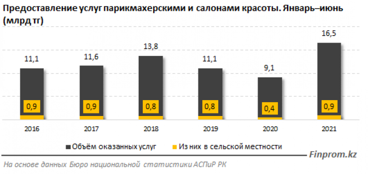 В целом объем услуг парикмахерских и салонов красоты в стране за первое полугодие составил 16,5 миллиарда тенге, на 80,9 процента больше, чем в первое полугодие 2020 года.