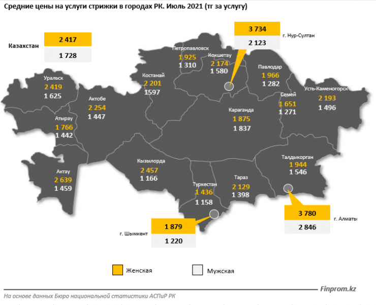Самые высокие цены на стрижки в июле среди регионов Казахстана наблюдались в Алматы (3780 тенге на женские и 2846 тенге на мужские). Второе место по ценам занял Нур-Султан (женская стрижка - 3734 тенге, мужская - 2123 тенге). Меньше всего стрижка стоила в Туркестане: женская стрижка - 1436 тенге, мужская - 1158 тенге.