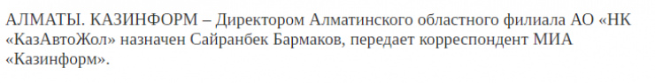 Через несколько дней, 23 апреля, в СМИ появилась информация о назначении Сайранбека Бармакова на должность директора алматинского филиала нацкомпании "КазАвтоЖол". Издания, в том числе государственные, в своих публикациях ссылались на официальное сообщение Министерства индустрии и инфраструктурного развития. На данный момент публикации о назначении Бармакова на должность в "КазАвтоЖоле" в Telegram-канале министерства нет.