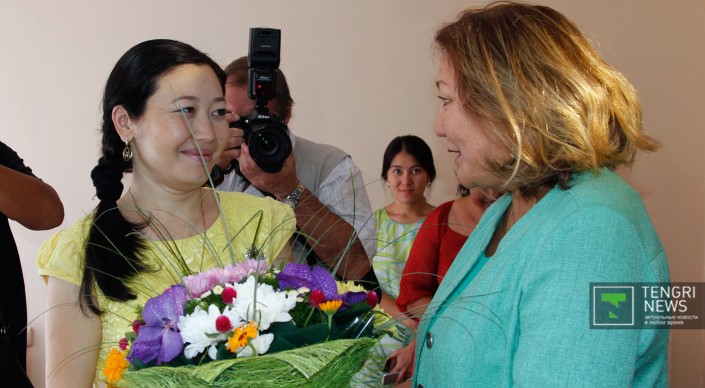 Заместитель акима Алматы Зауреш Аманжолова поздравляет Баян Абдуллину. Фото © Роза Есенкулова
