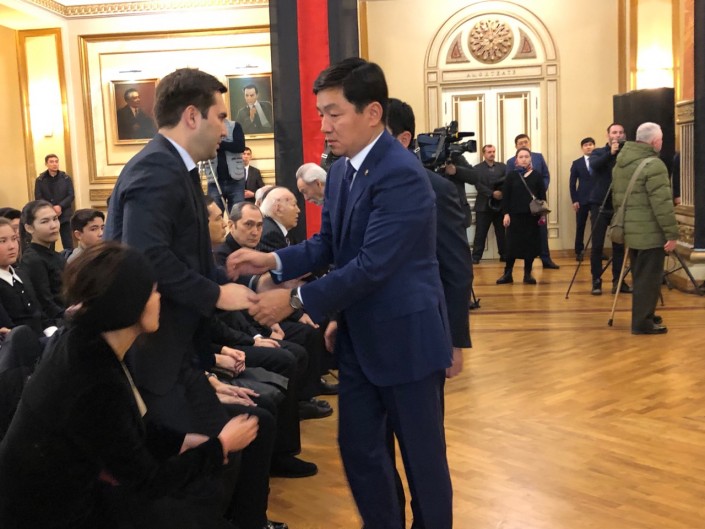 На церемонии присутствовали родные и друзья Султана Джиенбаева, а также государственные деятели.