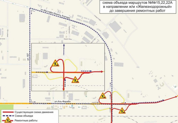 Сообщается, что будут перекрыты правосторонние съезды в направлении жилого массива Железнодорожный, а также подъем со стороны проспекта Аль-Фараби в направлении улицы Кошкарбаева.
