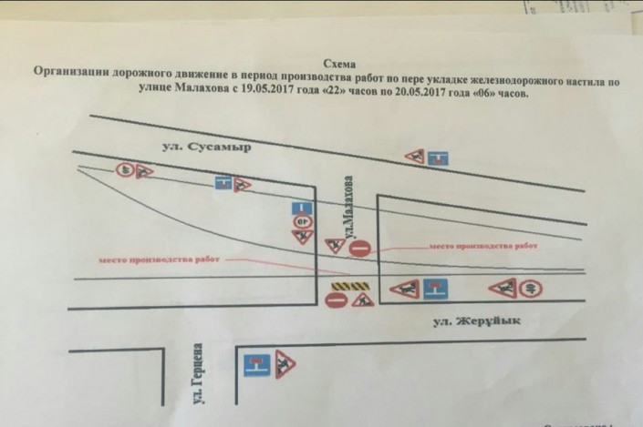 В связи с заменой настила железнодорожного переезда (№ 805) по улице Малахова движение транспортных средств с 22.00 19 мая до 06.00 20 мая будет ограничено от улицы Жеруйык до улицы Сусамыр.