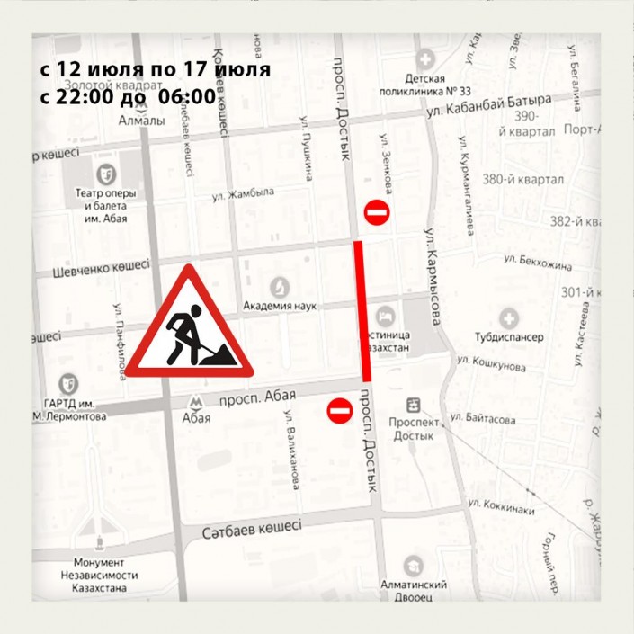 "В связи с дорожно-ремонтными работами на проспекте Достык участок от проспекта Абая до улицы Шевченко с 12 по 17 июля в ночь с 22.00 до 6.00 утра будет перекрыт. Подрядная организация ТОО "Есик Жолдары" приносит свои извинения за временные неудобства", - сообщили в пресс-службе компании.