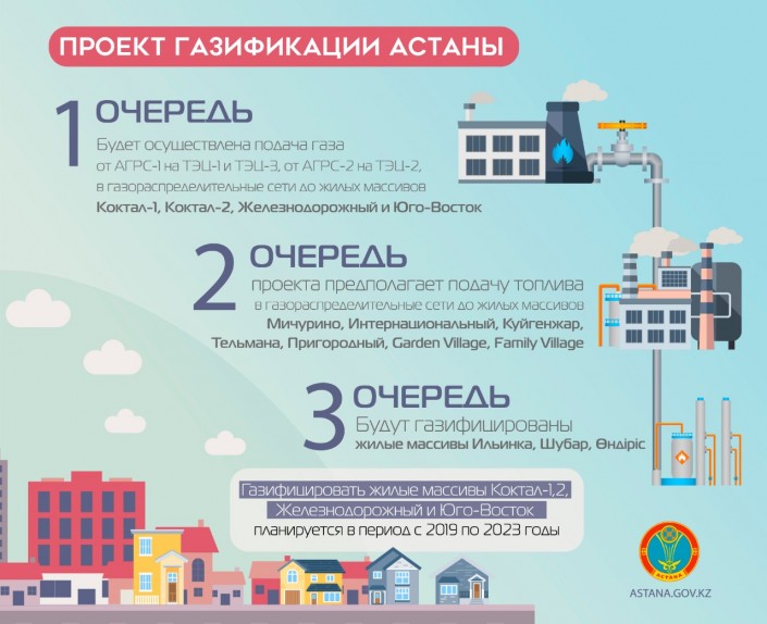 Проект газификации Астаны разделен на три очереди. В рамках первой очереди будет осуществлена подача газа от АГРС-1 на ТЭЦ-1 и ТЭЦ-3 и газораспределительные сети до жилых массивов Коктал-1, Коктал-2, Железнодорожный и микрорайон Юго-Восток.
