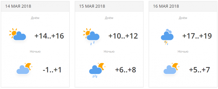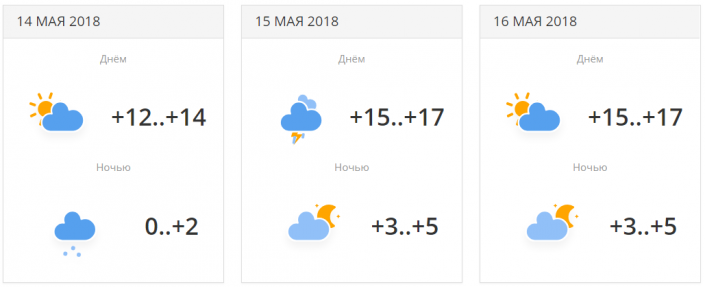 14 мая ночью ожидается минусовая температура: -1...+1. 16 мая - сильный дождь с грозой, +17...+19 градусов тепла.