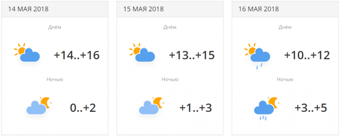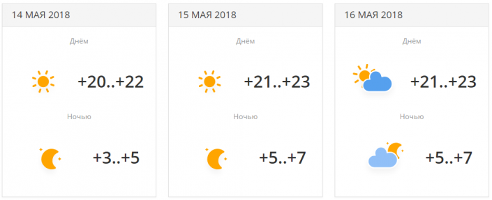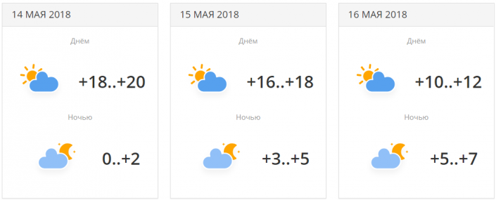 Днем резко похолодает: от +18...+20 градусов 14 числа до +10...+12 градусов 16 мая. Но поднимутся ночные температуры: с 0...+2 до +5...+7 градусов.