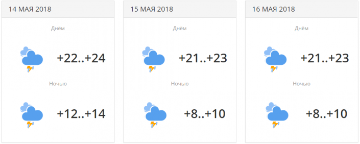 Ночные осадки, и дневная гроза 15 мая. Температуры будут находится в районе +12...+17 градусов днем и около 0...+5 градусов ночью.