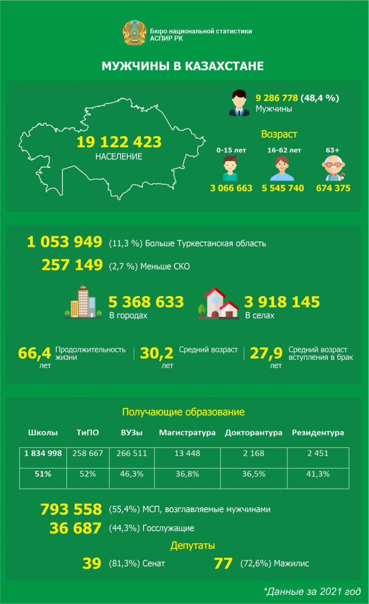 Наибольшее число мужчин проживает в Туркестанской области - 1,05 миллиона, наименьшее в Северо-Казахстанской области - 257 тысяч мужчин. 57 процентов мужчин являются горожанами (5,3 миллиона), 43 процента - сельчанами. Средний возраст мужчин в Казахстане - 30,2 года, средний возраст вступления в брак - 27,9 года.