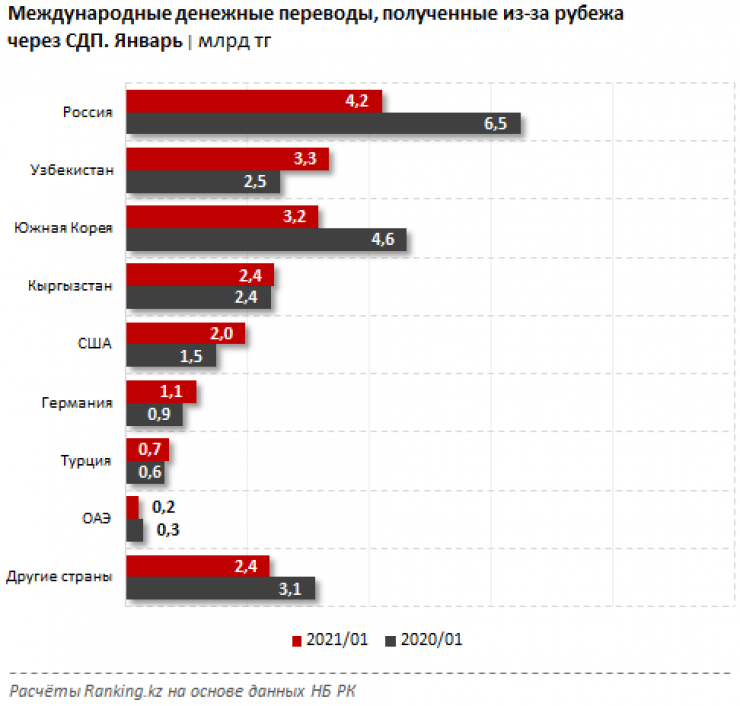 Среди стран, из которых в Казахстан были отправлены средства, традиционно лидирует Россия: оттуда в январе 2021 года было получено 4,2 миллиарда тенге, впрочем, сразу на 35,1 процента меньше, чем в январе 2020-го.