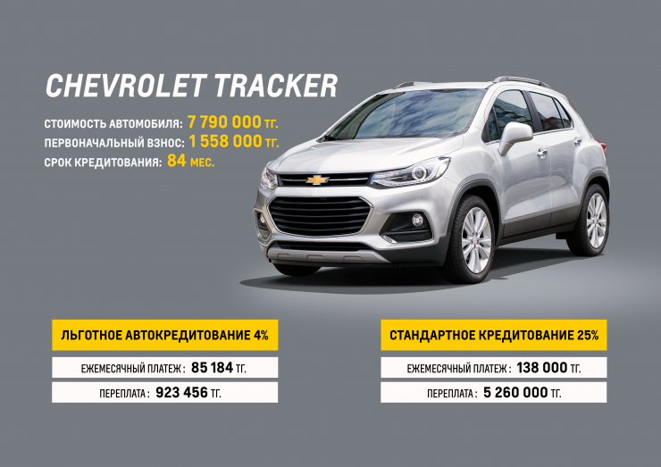 Цена нового кроссовера Chеvrolet Tracker составляет 7 790 000 тенге. Ниже мы приводим сравнительный анализ по льготному и обычному кредитованию на покупку этой модели сроком на семь лет в одном из банков Казахстана.