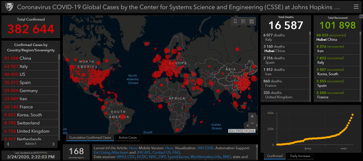 По данным исследователей американского университета Джона Хопкинса, коронавирусная инфекция зарегистрирована у 282,6 тысячи человек в 168 странах. Скончались от болезни более 16 тысяч человек. Почти 102 тысяч официально выздоровели после заражения.