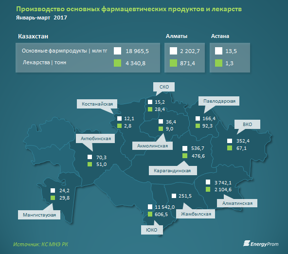 По данным аналитиков, за первый квартал 2017 года производство основных продуктов фармакологической промышленности достигло в стоимостном выражении 19 миллиардов тенге - это сразу в 2,2 раза больше, чем в аналогичном периоде 2016 года.