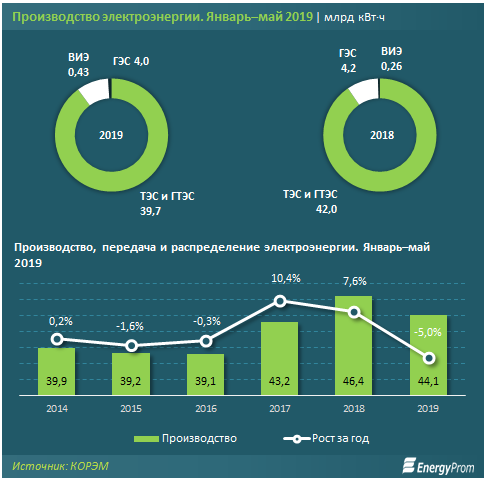 По данным КОРЭМ (Казахстанского оператора рынка электрической энергии и мощности), производство электроэнергии составило 44,1 миллиарда киловатт в час - на 5 процентов меньше, чем за аналогичный период годом ранее (46,4 миллиарда киловатт в час). Данные незначительно отличаются от данных Комитета по статистике МНЭ РК.
