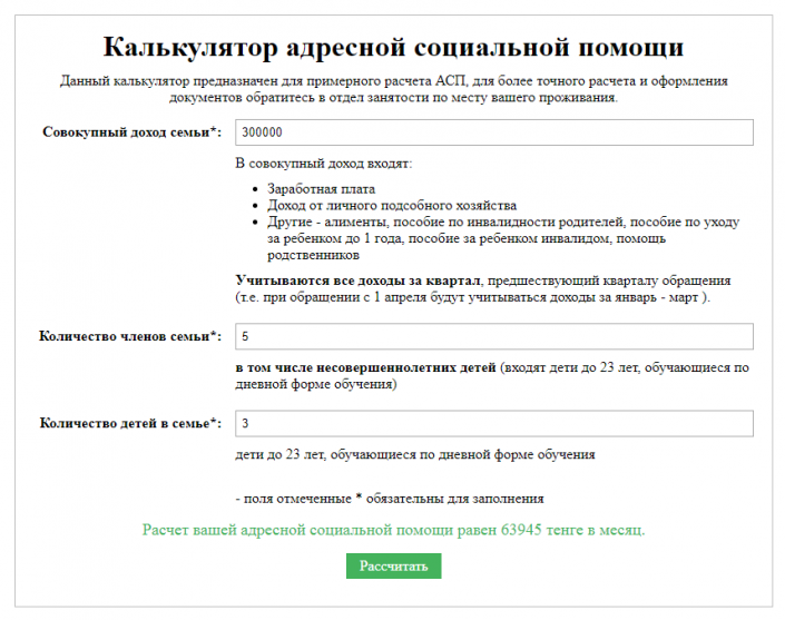 Теперь для этого не нужно идти в отдел занятости и соцпрограмм. Достаточно зайти на сайт акимата Сарани и найти калькулятор, разработанный местными специалистами. Он доступен по этой ссылке. Пользователю необходимо указать совокупный размер дохода, количество домочадцев и отдельно количество детей.