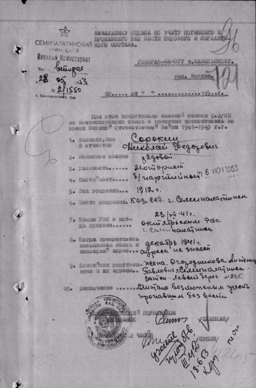 В это же время в Эстонии найдены останки еще одного солдата - Сорокина Николая Федоровича, 1912 года рождения, уроженца Семипалатинска. Личность его установлена по медали "За отвагу". В 1953 году его также разыскивала жена, которая на тот момент проживала по адресу Затон- Левый берег, 235. Об этом свидетельствует установленная поисковиками анкета-опросник супруги Сорокина.