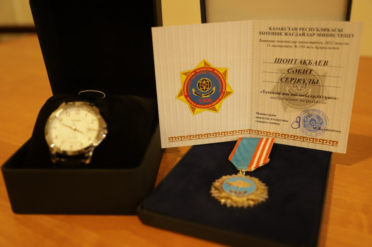 Героя Сабита Шонтакбаева наградил первый вице-министр по ЧС Ибрагим Кульшимбаев. Мужчине вручили нагрудный знак "Төтенше жағдайдағы ерлігі үшін".