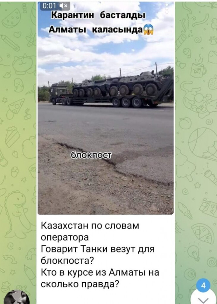 Пользователи Казнета распространяют сообщение о том, что вокруг Алматы якобы выставляют блокпосты, которые будет охранять военная техника. В качестве "подтверждения" они рассылают видео с бронетранспортерами, передает Tengrinews.kz со ссылкой на StopFake.