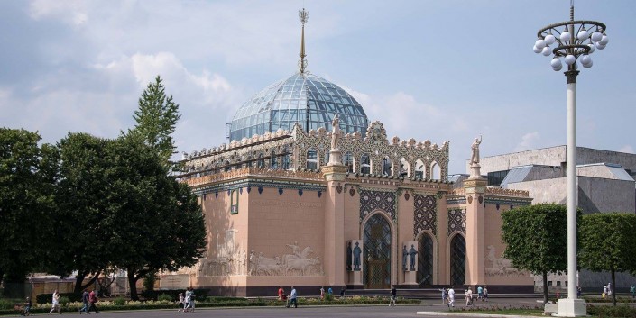 Павильон "Казахстан" появился на ВДНХ в 1937 году, его построили по проекту архитектора Владимира Костенко (1881-1956) в самом начале главной аллеи выставки. Это была деревянная временная шестиугольная конструкция с декоративной башней. В 1939 году башню заменили на небольшой купол, бело-голубые фасады украсили орнаментами, вход же выделили глубоким порталом, подчеркивая таким образом традиции древнего зодчества Казахстана.