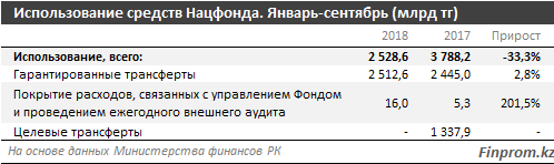 В отличие от поступлений, расходы и использование средств в Нацфонде сократили на 33,3 процента за аналогичный период. За январь-сентябрь сумма использованных средств составила 2,53 триллиона тенге (годом ранее - 3,8 триллиона тенге).