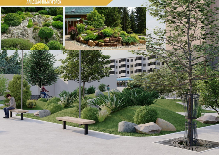 Символом "Места встречи" станет арт-скульптура - мужчина с цветами под зонтом. Вокруг скульптуры расположатся скамейки со столиками для отдыха, появится альпийская горка с ландшафтными кустарниками.