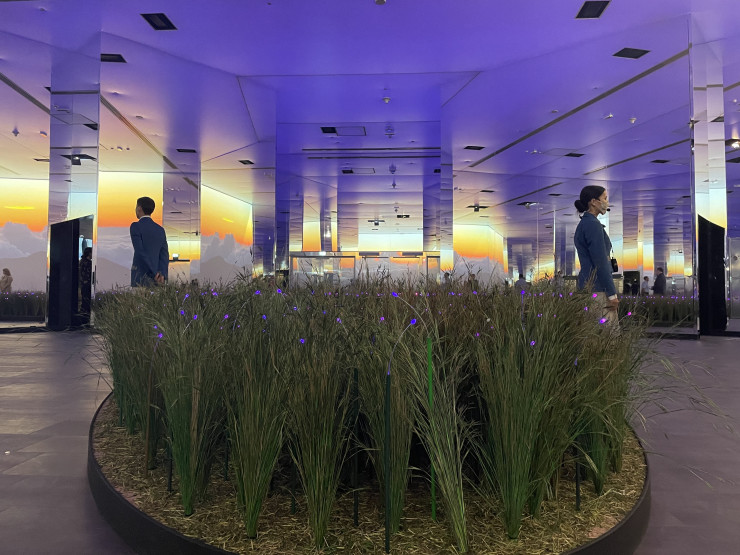 Внутри павильона посетителей встречает прохлада. Главный зал называется Зоной Великой степи. Здесь вместо стен зеркала и экраны. Они создают иллюзию бесконечного пространства, а вместе с оформлением из искусственной травы - вид бескрайней степи.