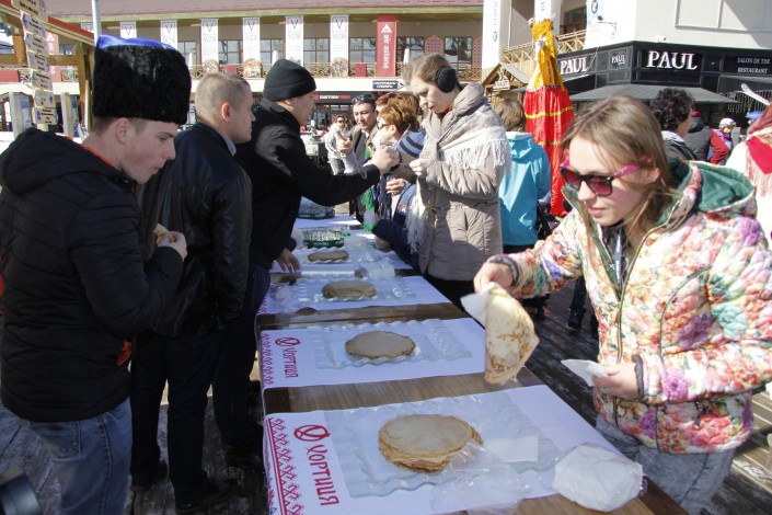 К приходу гостей возле первого перевала курорта уже ожидали более двух тысяч блинов, которые испекли в последний день Масленицы. Стоит отметить, что традиционные горячие блины разошлись за 15 минут. Как известно, в народе принято отмечать праздник шумно и весело, чтобы пробудить весну. Для гостей курорта в этот день организаторы приготовили выступления народных ансамблей, диджея, этнического хора, а также хоровод и народные пляски, различные конкурсы.