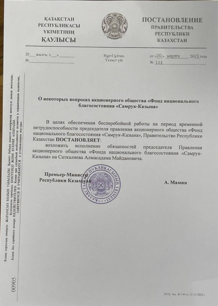 Несколькими днями ранее в Telegram-канале Kozachkov offside появилась фотография документа, похожего на постановление правительства, в котором сообщалось, что на период "временной нетрудоспособности председателя правления" обязанности главы фонда возложены на Алмасадама Саткалиева.