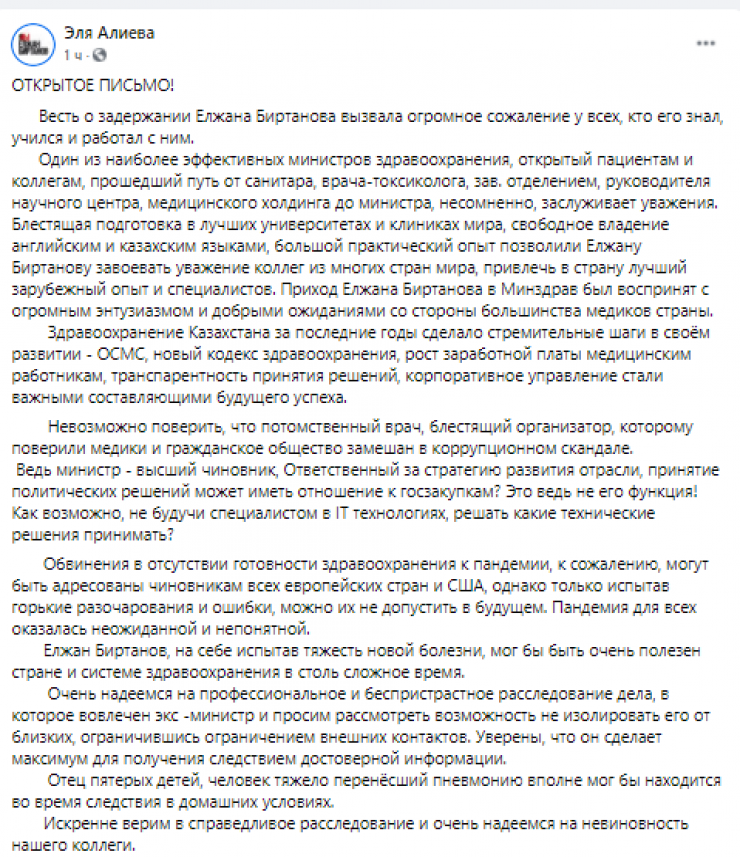 "Один из наиболее эффективных министров здравоохранения, открытый пациентам и коллегам, прошедший путь от санитара, врача-токсиколога, завотделением, руководителя научного центра, медицинского холдинга до министра, несомненно, заслуживает уважения. Блестящая подготовка в лучших университетах и клиниках мира, свободное владение английским и казахским языками, большой практический опыт позволили Елжану Биртанову завоевать уважение коллег из многих стран мира, привлечь в страну лучший зарубежный опыт и специалистов. Приход Елжана Биртанова в Минздрав был воспринят с огромным энтузиазмом и добрыми ожиданиями со стороны большинства медиков страны", - говорится в письме.