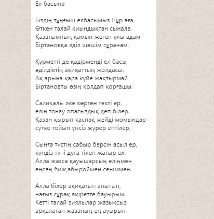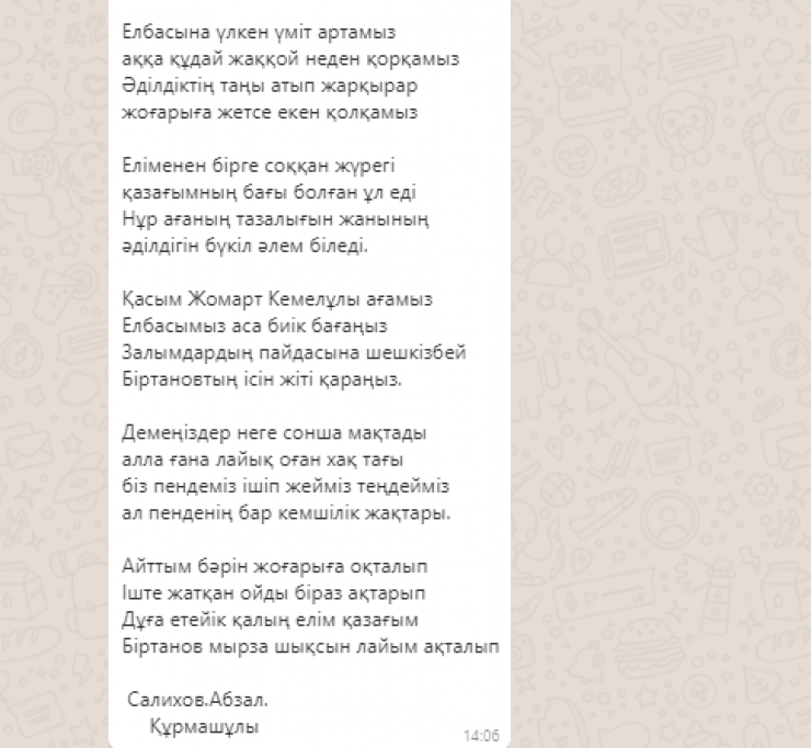 Кроме того, в мессенджере WhatsApp распространяется стихотворение в поддержку экс-министра за авторством Абзала Салихова.
