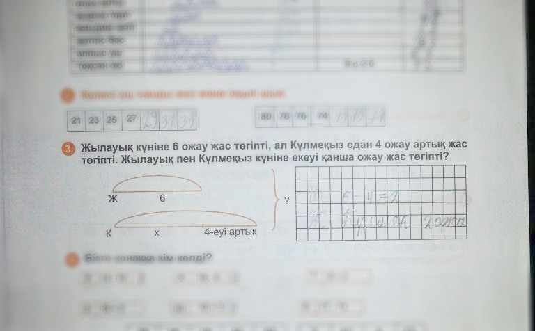 Отметим, что родитель говорил о заданиях в учебнике 2-го класса "Әдебиеттік оқу" (Б.А. Тургынбаева, З. Муфтибекова, издательства "Алматыкітап", 2012 года), а также о задаче из рабочей тетради "Математикадан 105 сабақ" (составитель Н.А. Жазыкбаева).