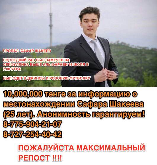 Между тем, как сообщила у себя в Facebook другая участница поисков Сафара Шакеева Виктория Моминбаева, в воскресенье мусульмане и православные Казахстана во всех мечетях и храмах страны молились за благополучное возвращение пропавшего сына Еркеша Шакеева. Кроме этого, молитву для возвращения Сафара Шакеева домой читали буддийские монахи в монастыре Далай Ламы.