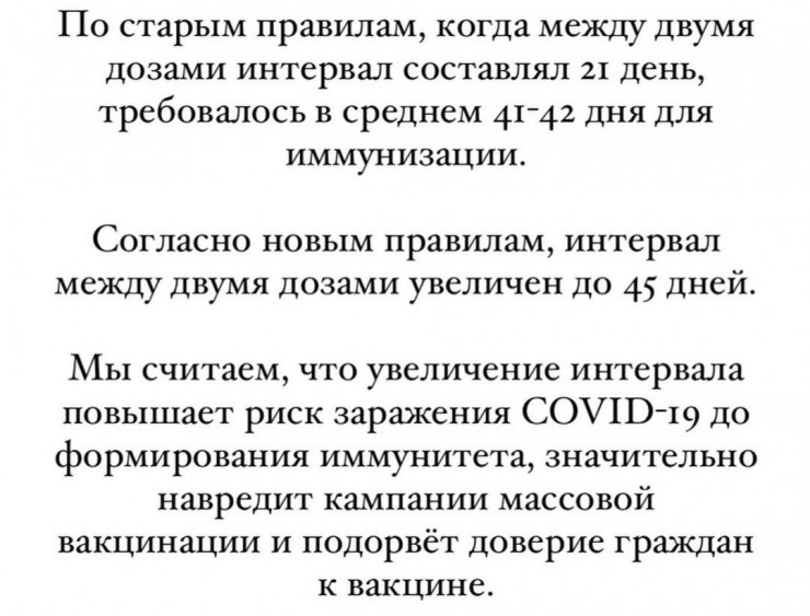 Согласно последнему постановлению главного санитарного врача, интервал между двумя дозами увеличен до 45 дней (ранее был 21 день), а в целом допускается вакцинация вторым компонентом "Спутника V" в течение 90 дней. Однако медики не согласны с этим решением. На странице независимого научно-медицинского сообщества в Instagram появилось срочное обращение.