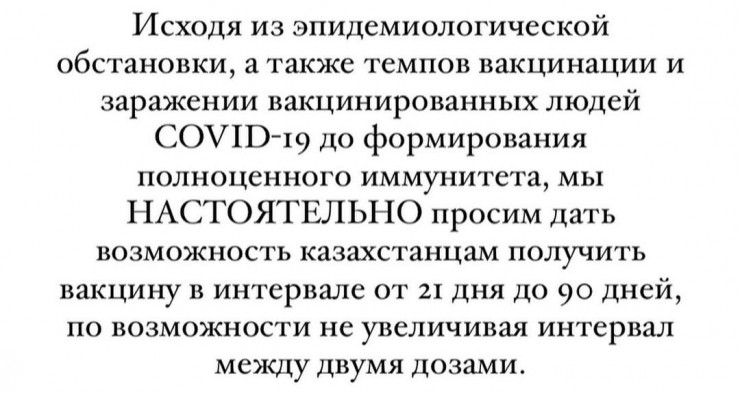 Представители сообщества Medsupportkz обратились к главному санитарному врачу, попросив объяснить, на каком основании приняты новые правила о вакцинации и как это поможет иммунизации населения от COVID-19. Врачи и ученые просят дать казахстанцам возможность получить возможность вакцину в интервале от 21 дня до 90 дней.