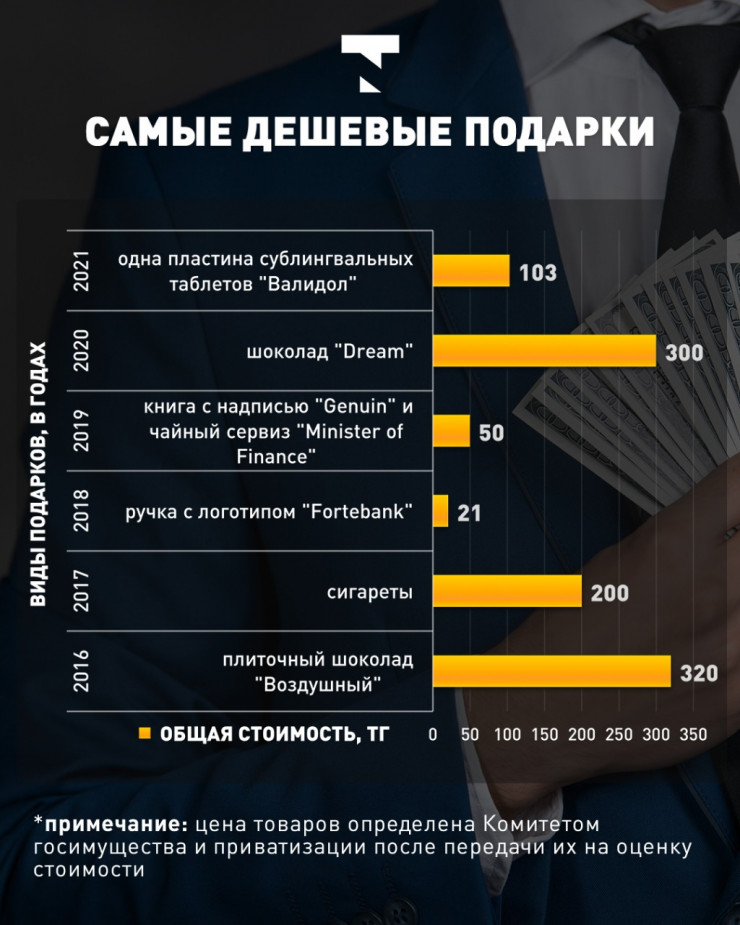 "Ассортимент сданных государству подарков очень обширен. Среди них имеются и необычные предметы. К примеру, географическая карта или блок сигарет: оба предмета уничтожены. Также имелись три ручных веера стоимостью почти в 2000 тенге, но проданные всего за 134 тенге. Еще были шесть антивирусных программ: их оценили в 22 500 тенге, но реализовали только за 4 900 тенге. А банная шапка, оцененная в 1000 тенге, была продана за 260 тенге.