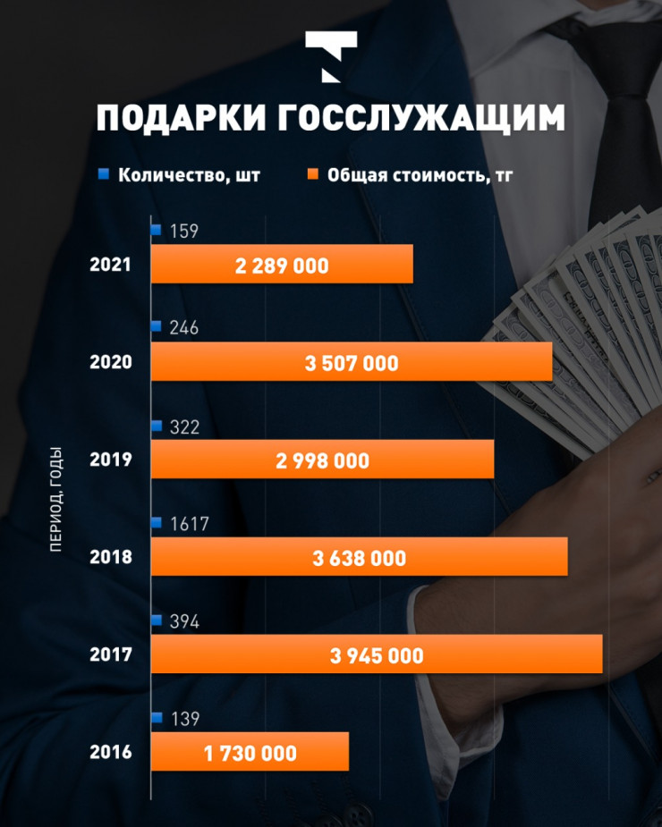 Общая оценочная стоимость подарков, сданных госслужащими за шесть лет, составила более 18,1 миллиона тенге. Самые дорогие из них были получены в 2017 году. Тогда чиновники сдали предметы на 3,9 миллиона тенге.