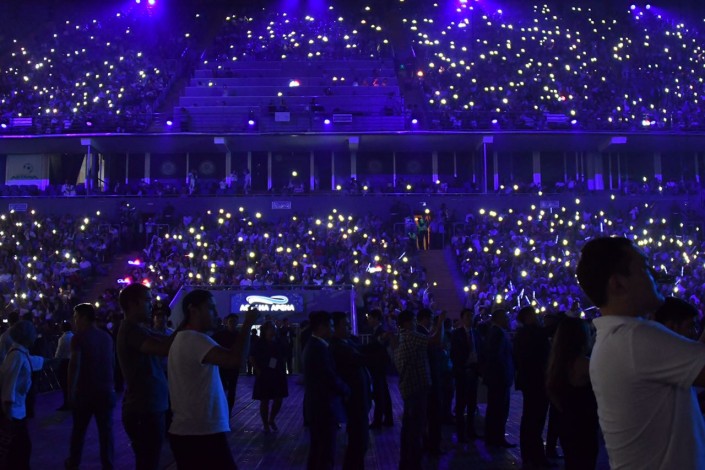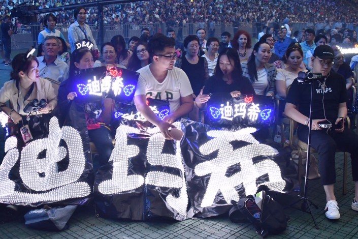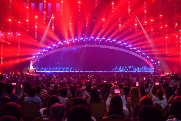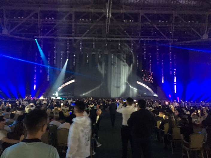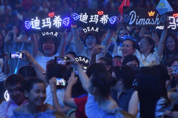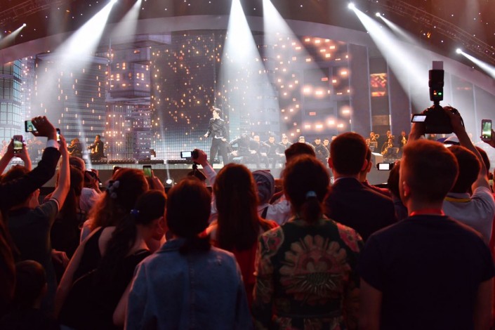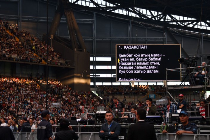 На противоположной от сцены стене организаторы установили огромный экран, где транслировались слова казахских песен. Но чтобы подпевать Димашу, зрителям пришлось бы отвернуться от сцены. Терять из вида любимого певца не хотел никто, поэтому подпевали ему только самые преданные фанаты, из тех, кто знал его песни наизусть.