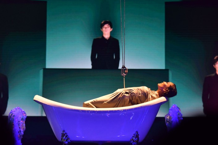Время от времени с потолка спускалась девушка-акробат в кольце. Ее воздушный танец сопровождал самые романтичные песни Димаша.