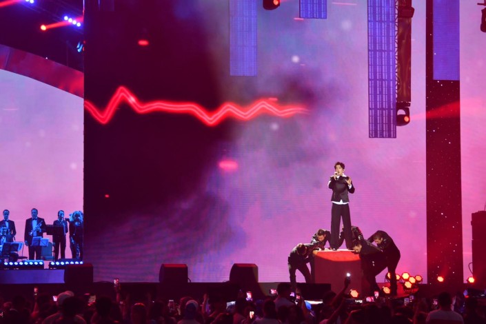 Выступления Димаша состояли из пяти блоков, за время которых он сменил пять костюмов от традиционных казахских, которые мы уже помним по его выступлениям на конкурсе I'm a Singer в Китае, до современных блестящих и черных костюмов. Каждый соответствовал стилю песен.