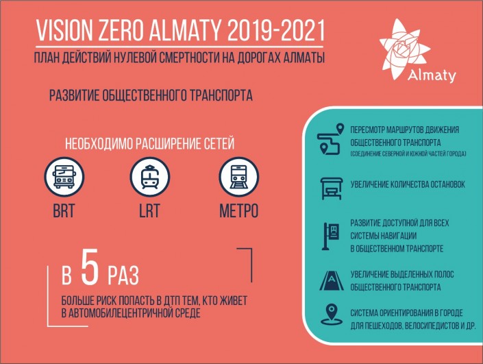"Согласно глобальной концепции Vision Zero пешеход является приоритетным участником дорожного движения. Город должен развиваться так, чтобы минимизировать передвижение людей на индивидуальном авто и увеличить мобильность посредством развития различных видов общественного транспорта, которому должен быть предоставлен четкий приоритет. Согласно исследованиям, у людей из районов с развитым общественным транспортом шанс попасть в ДТП в пять раз меньше, чем у тех, кто живет в автомобилизированной среде. Расширение линий BRT, LRT и метро является одним из основных инструментов в сокращении ДТП", - комментируют в акимате.