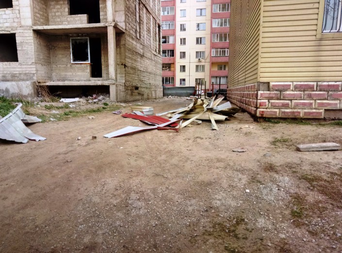К приезду наших корреспондентов на самом верху здания все еще висели большие куски арматуры. На ветру они раскачивались в разные стороны. Казалось, что в любую минуту они сорвутся вниз. Опасную территорию оградили лентой, но за ней беспрепятственно ходили люди, гуляли дети. Куски металла убрали лишь после встречи жильцов дома с представителями акимата района имени Казыбек би и управляющей компании.