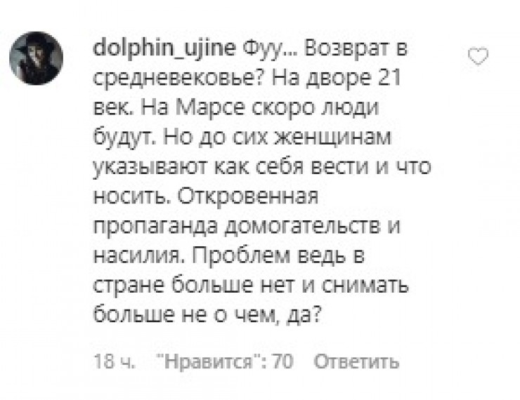 "Отвратительный ролик о том, что вместо того, чтобы преследовать факт насилия и дискриминации, общество преследует женщин. Учить, какую одежду носить, видимо, важнее, чем учить не насиловать и не домогаться, да? Мне очень жаль, что в нашем "светском и равном" обществе транслируются и поддерживаются такие мысли", - написала пользовательница almasemai.