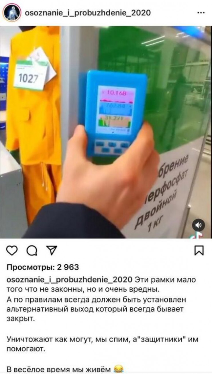 Автор проводит замеры неким прибором у рамки противокражной системы при входе в магазин. Мужчина демонстрирует на камеру результаты замера, утверждая, что показатели "доходят до тысячи", что якобы может спровоцировать опасные заболевания.