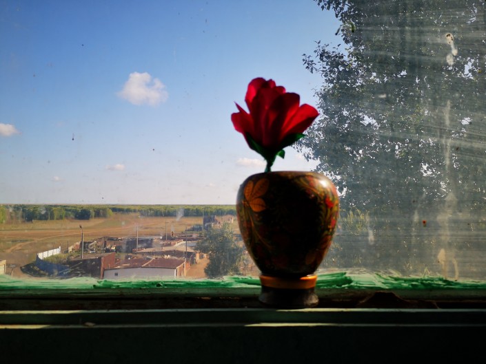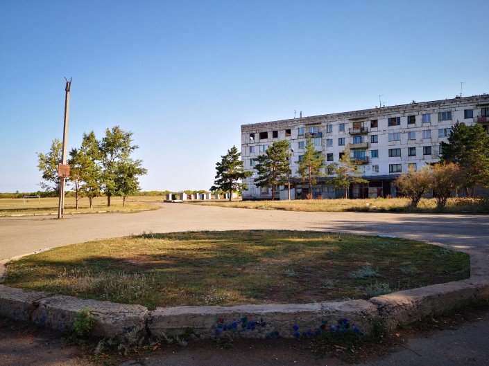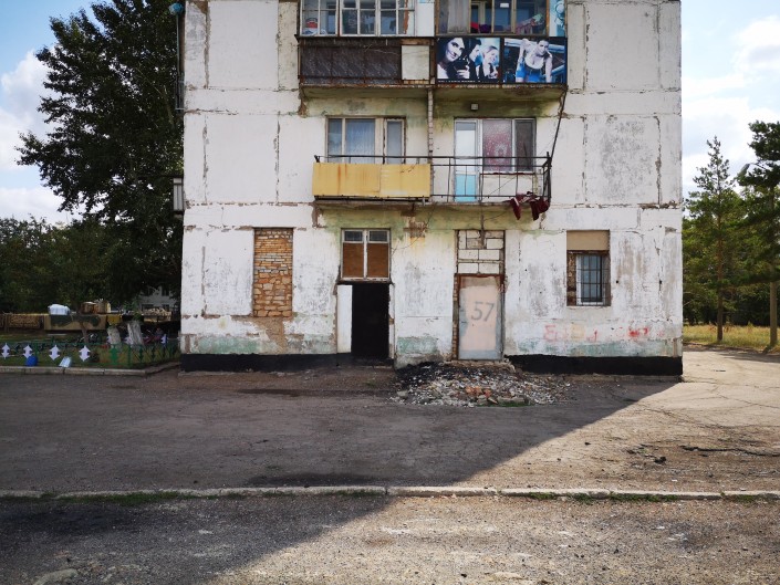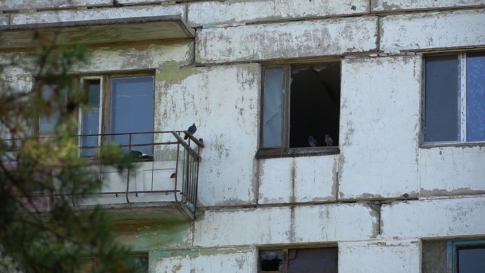 В самом центре стоит пятиэтажка. Некоторые квартиры пустуют, в них нет окон, там гуляет ветер и летают птицы.