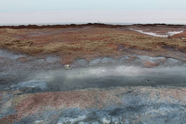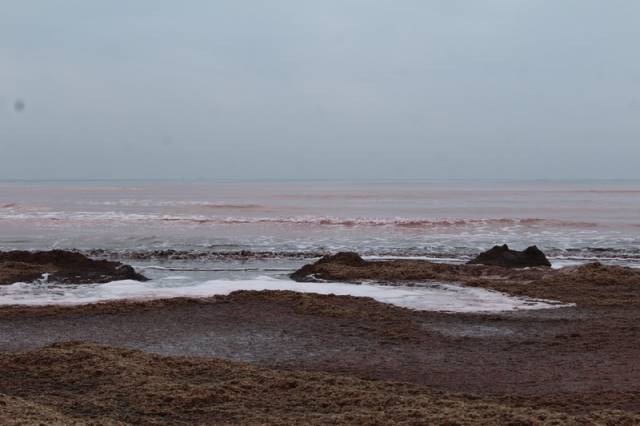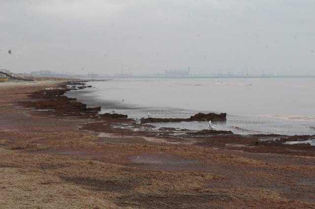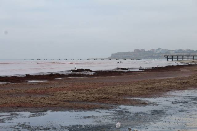 Вода в Каспийском море окрасилась в красный цвет на набережной первого микрорайона от гостиницы "Шагала" до пляжа "Нур плаза" в Актау. На берегу много тины и водорослей, сообщает Lada.kz.