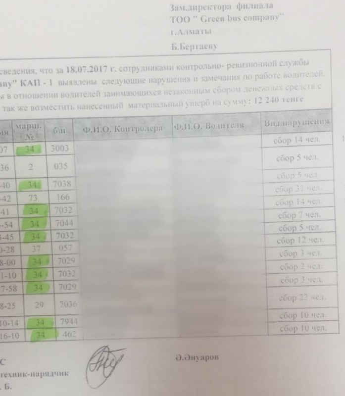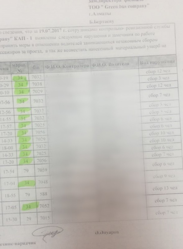 По его информации, водители, которые бастуют, не пробивают билеты пассажирам, которые платят наличными. Более 80 процентов нарушений невыдачи билетов приходится на 34 маршрут. Баурджан Кулишев поделился отчетами контролеров Green Bus Company о нарушениях водителями автобусов.