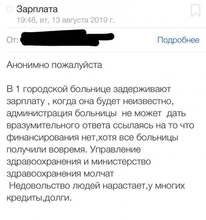 В социальных сетях распространяется письмо, авторы которого утверждают, что врачам столичной городской больницы № 1 задерживают зарплату.
